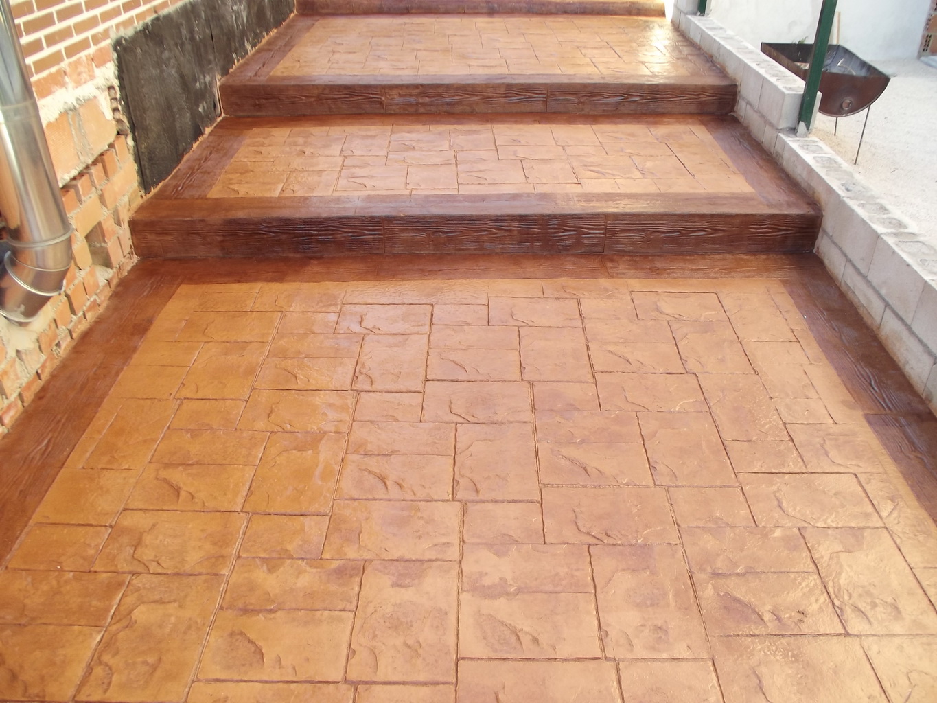 - El hormigón impreso se conoce desde mas de 30 años, pero hoy está en boga gracias a la exuberante gama de colores y texturas, que permiten hacer pavimentos resistentes, vistosos y duraderos. Al ser impermeable, soporta el ataque de ácidos y manchas de grasa y aceite, además puede utilizarse en zonas muy castigadas por el tránsito, como aceras, parques, rampas, recintos feriales, etc… Estos factores, sumados al casi nulo mantenimiento, explican que triunfe en las viviendas con jardín, desplazando a los pavimentos tradicionales.El hormigón impreso en realidad es una solera cuya superficie viene pigmentada y tiene un “bajorrelieve”, grabado mientras está fresco mediante moldes de neopreno que simulan las piezas y texturas más variadas. La estampación puede imitar adoquines, piedra, baldosas, pizarras… Al ser antideslizante, también da excelente resultado en la zona de la piscina. La clave de este pavimento es la capa superficial endurecedora y coloreada, que viene en polvo ya preparada de fábrica.